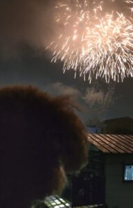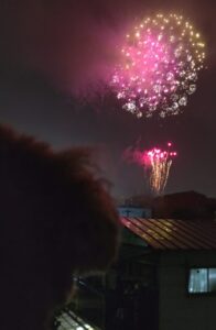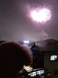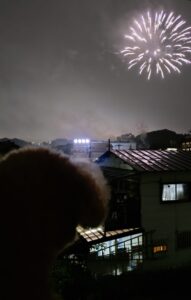 お家の特等席から鑑賞できるなんて最高🙆🏻‍♀️げんちゃんがワンコラ言うくらい、けっこう音は大きいんですか?